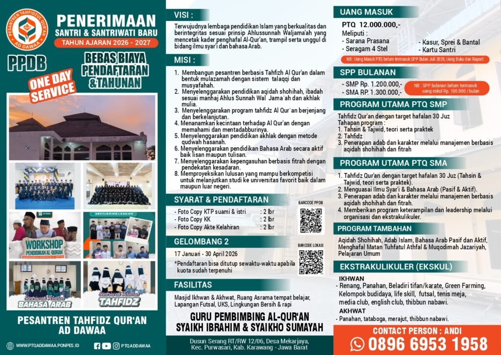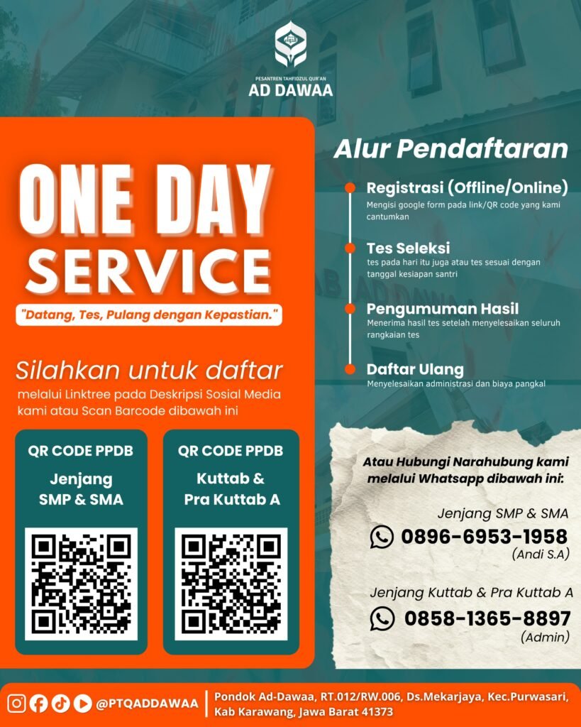 Mau daftar sekolah yang gak pakai ribet dan gak perlu nunggu lama? Di Pesantren Tahfidzul Qur’an Ad Dawaa, kami hadirkan sistem ONE DAY SERVICE dengan semangat: 👉 “Datang, Tes, Pulang dengan Kepastian.”
